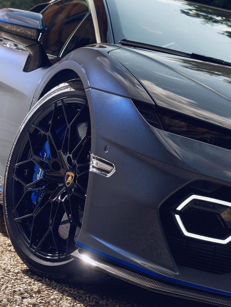 Dressed in a shimmering Grigio Serget, the bodywork features subtle blue metallic flakes that catch the sunlight in spectacular fashion. Gloss black lower panels and a Blu Royal pinstripe add contrast and aggression, especially across the rear wing. Carbon-effect elements on the front splitter, diffuser, and air scoops up the motorsport vibe, while matte black tailpipes and Velador wheels with blue brake calipers round off the bold aesthetic.