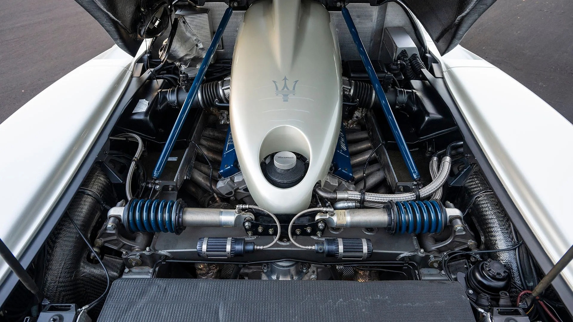 Finished in Bianco Fuji pearlescent white with signature blue accents over a Blu leather and BrighTex fabric interior, this 2005 example was designed to evoke Maserati’s storied racing heritage. The odometer indicates just over 11,500 kilometers at the time of cataloging.