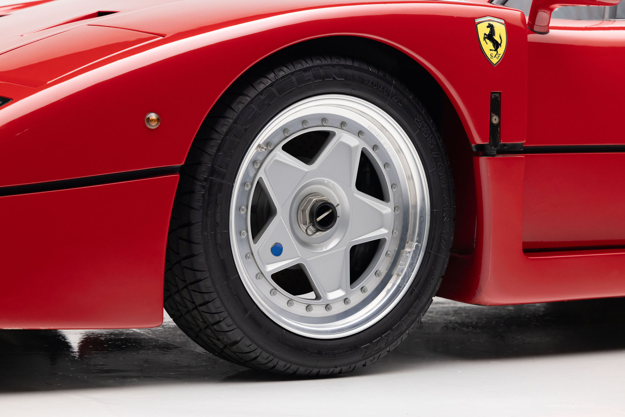 With just 360 kilometers (~224 miles) on the odometer, this Ferrari displays remarkable originality, evident in factory markings and body numbers, including original blue stickers on the wheels (noting the wheel nuts were torqued on the assembly line), original 1989 date-coded tires, and original witness markings on all fittings. Under close examination, it is very clear that this F40 has never been disassembled and remains in incredibly original condition, with significant carbon weave visible throughout the car.