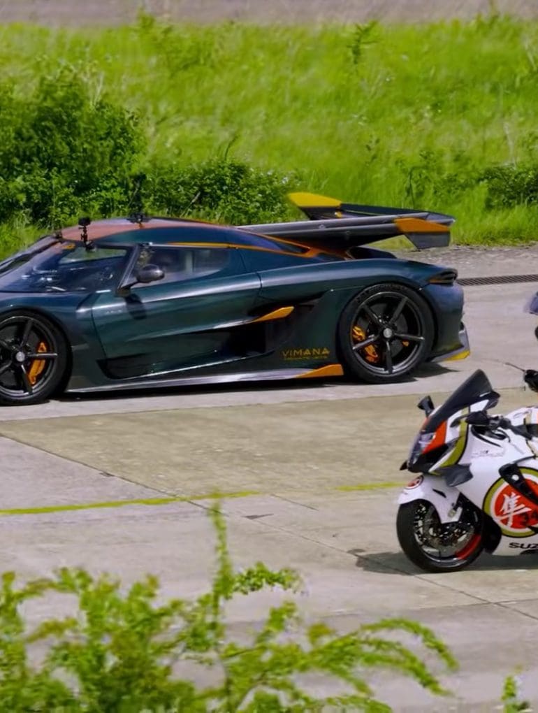As expected, traction was a key factor in the races. In multiple runs, the Hayabusa’s launch was unpredictable, with wheelies and a grabby clutch complicating the action. Despite Jesko’s massive power, it couldn’t quite overcome the Hayabusa’s power-to-weight advantage, falling just short in the best-of-three showdown.
