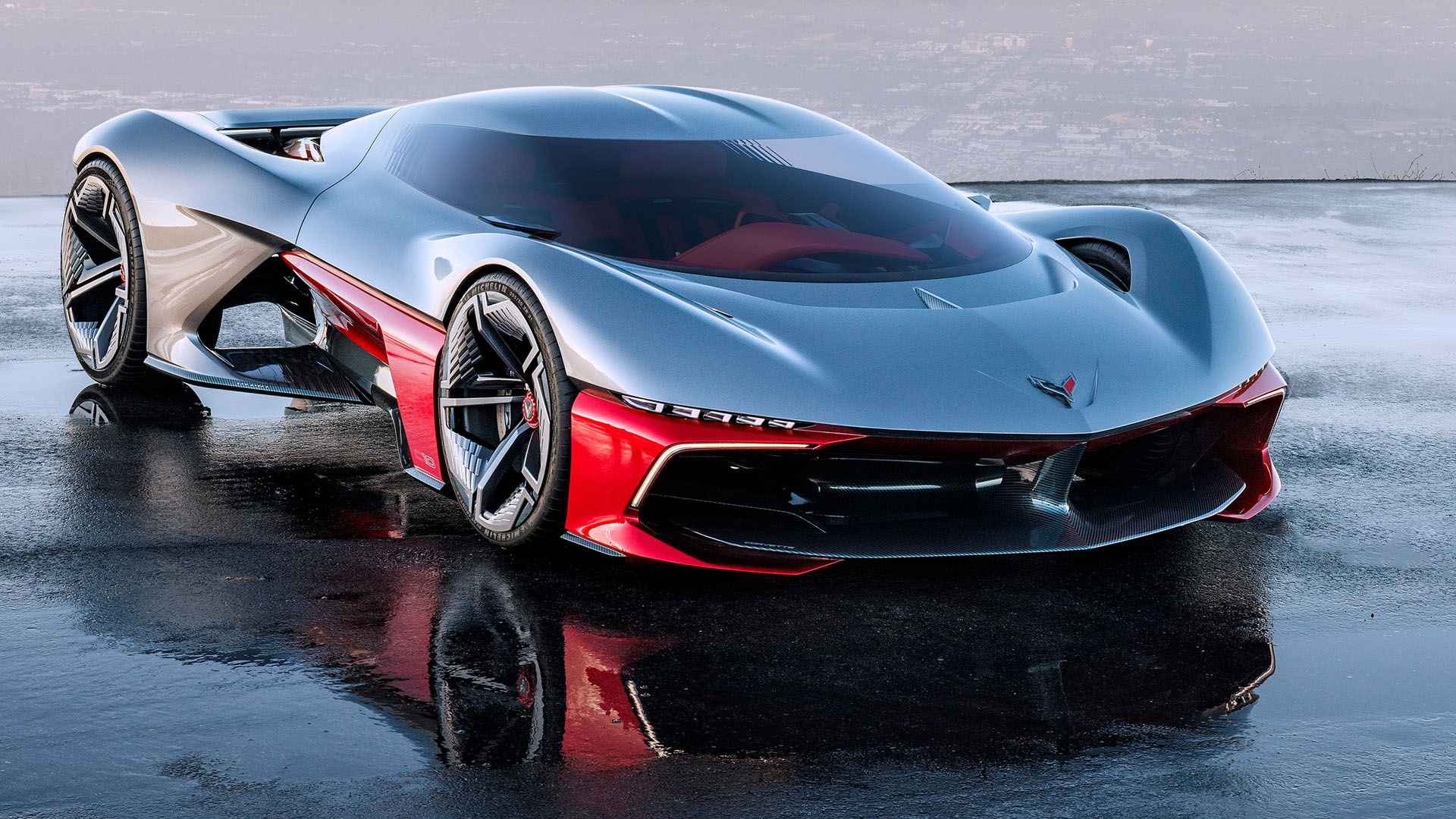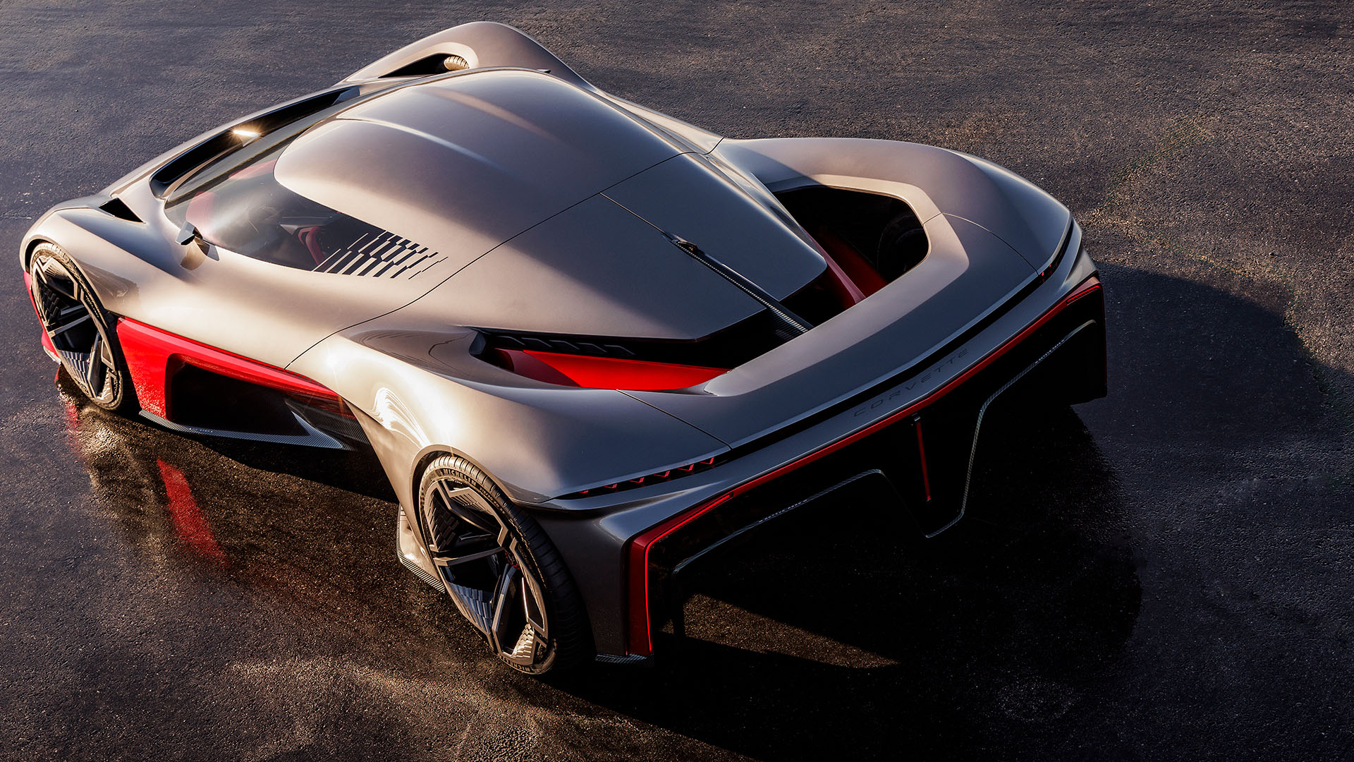 The California Corvette Concept rides on a tunneled carbon tub chassis and features large staggered wheels—21 inches up front, 22 in the rear—with active aero, a rear air brake, and a prismatic T-shaped battery pack assumed to enable low seating and optimized airflow.